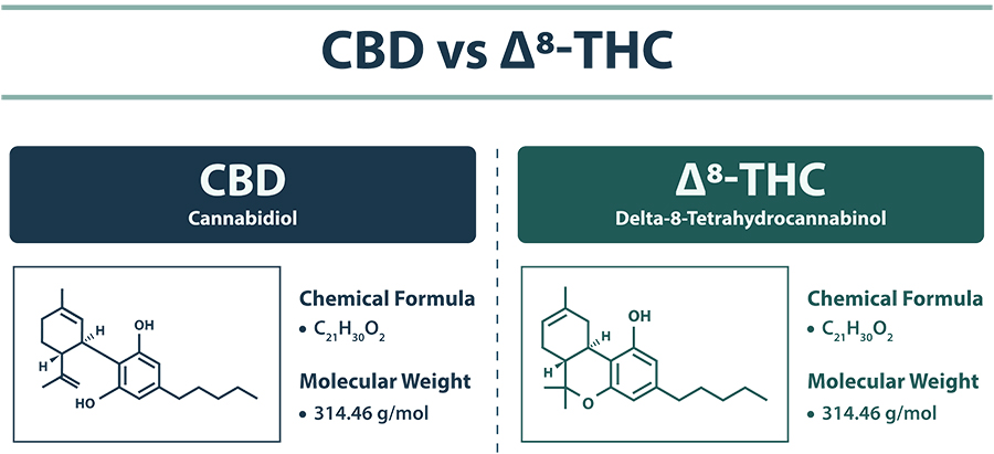 Here is a quick visual aid/infographic of a cannabinoid comparison between CBD and Delta-8 THC.
